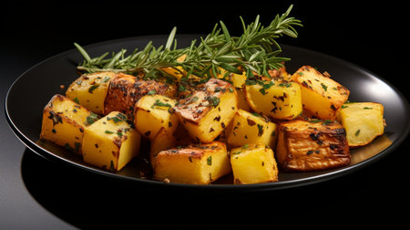 Oven baked potatoes with rosemary set, on plate, on black wooden table background, top view flat lay, with copy space for text