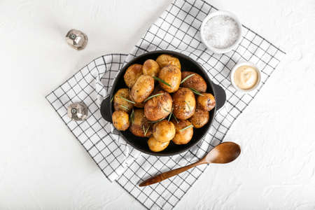 Frying pan with baked potatoes and rosemary on light background
