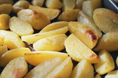 Crispy oven baked potatoes. Delicious golden roasted potatoes for home dinner just out of the oven. family weekend dinner. close up view