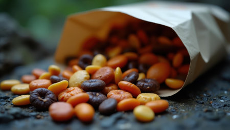 Trail mix bag open ready for late-night star-gazing snacks , Professional stock photo, AI generated photograph