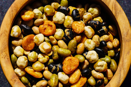high angle view of a bowl with an assortment of roasted soya beans of different colors, served as a snack, on a veined storne surface