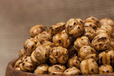 Roasted spicy chickpeas , yellow chickpeas on wooden background .