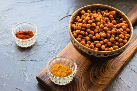Delicious snack, fragrant baked with curry spices and smoked paprika chickpeas in a brown bowl and spices on a dark background with space for text. Healthy eating concept