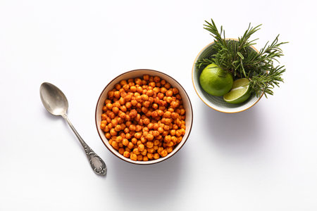 Bowl of tasty fried chickpeas with lime and rosemary on white background