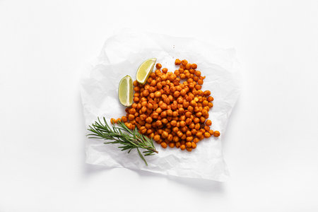 Baking paper with tasty fried chickpeas, lime and rosemary on white background