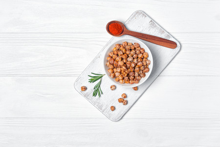 Top view on roasted salty and spicy chickpeas in bowl with rosemary and hot pepper on white wooden background with copy space