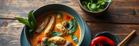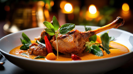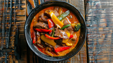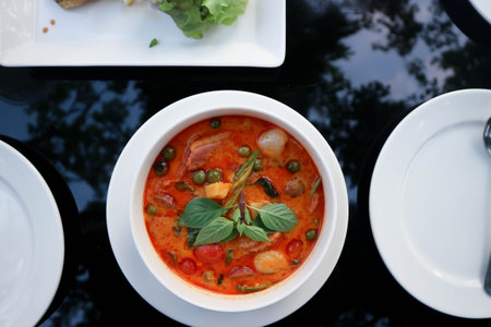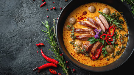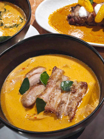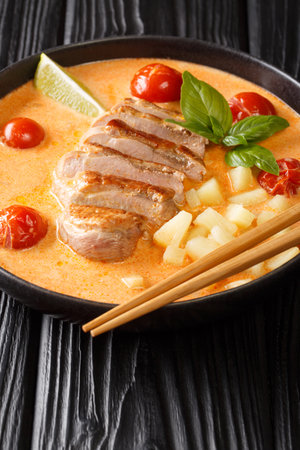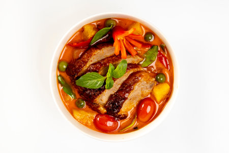 Thai red curry with duck served in a bowl, garnished with basil and bell peppers. Spicy national Thai dish. Concept of Asian cuisine, culinary, traditional recipes, exotic dining, healthy eating