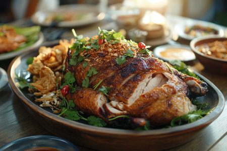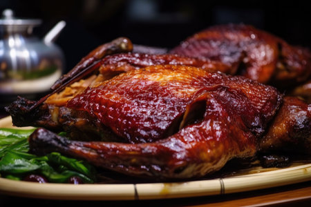 close-up of fried duck, with its crispy skin and juicy meat on full display, created with generative ai