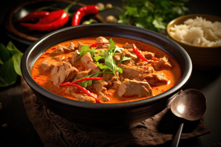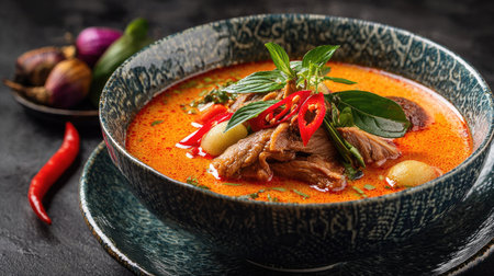 A delightful bowl of Thai red curry featuring tender meat and vibrant vegetables, garnished with fresh herbs and chili, perfect for food lovers.