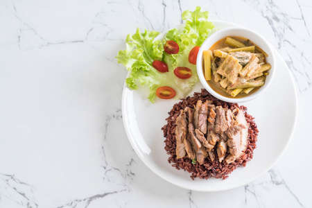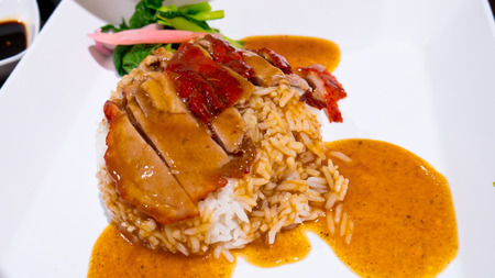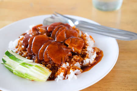 Barbecued red pork in sauce with rice on wood table. Thai food