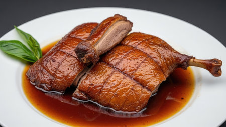A close-up view presents a roasted duck dish, carefully arranged on a white plate. The duck, with its crispy, brown skin, is partially submerged in a rich, dark sauce. Fresh green leaves provide a decorative contrast. This image could be used for culinary content, food blogs, or restaurant marketing materials.