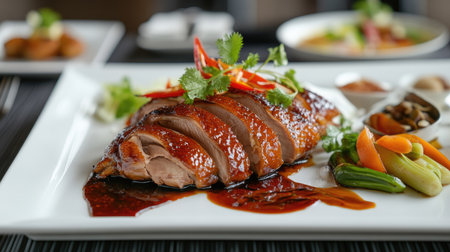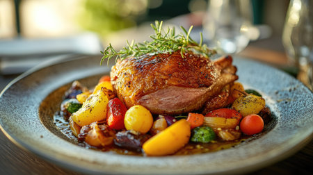 A beautifully presented roasted duck dish, garnished with fresh herbs and served with colorful vegetables, perfect for gourmet dining or culinary displays.