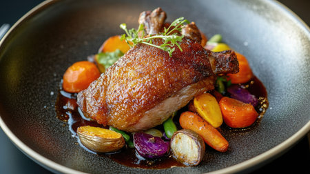 A serving of traditional French duck confit with crispy skin, resting on a plate with vibrant vegetables, captured in natural light for a warm culinary presentation.