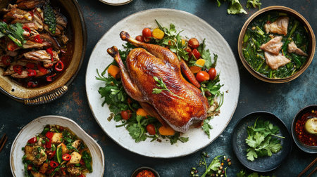A beautifully roasted duck is presented on a white plate, garnished with fresh herbs and vibrant vegetables, showcasing an enticing meal perfect for any celebration.