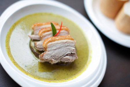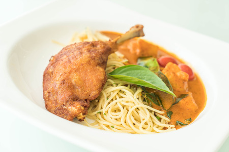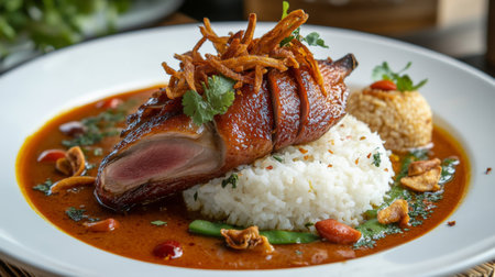 Deep fried duck leg with Thai style red curry serving with white rice on white plates