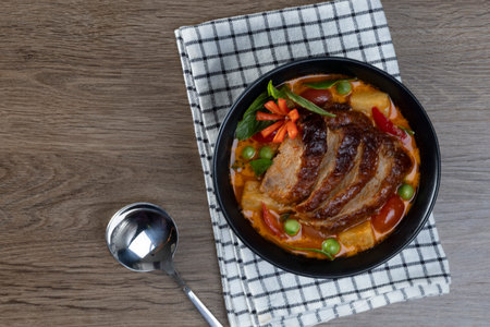 Pork red curry served and decorated with vegetables, herbs and spices on rustic background - Thai food