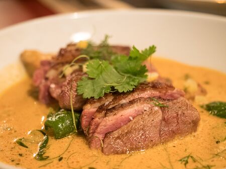Japanese cuisine. Sliced duck breast in red curry sauce.