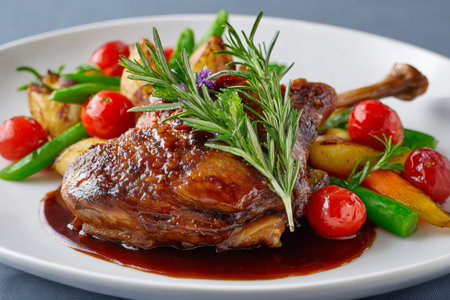 Delicious roasted duck leg served with rosemary and vegetables on a white plate, perfect for a gourmet meal