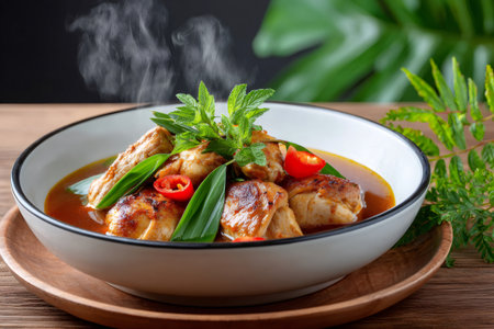 chicken curry or kari ayam served on bowl, isolated on wood background