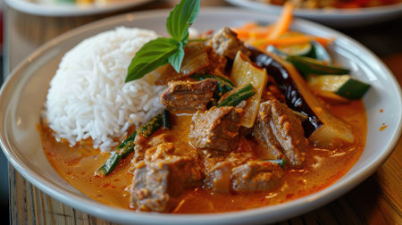 A delicious plate of Thai beef curry sits alongside fluffy white rice. Fresh herbs and colorful vegetables enhance the dish at a cozy dining venue.