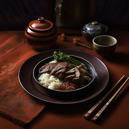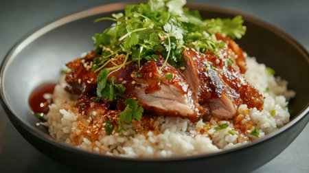 This appetizing image showcases a plate of succulent roast duck placed on fluffy rice, topped with crispy onions and fresh herbs, exuding delicious flavors.