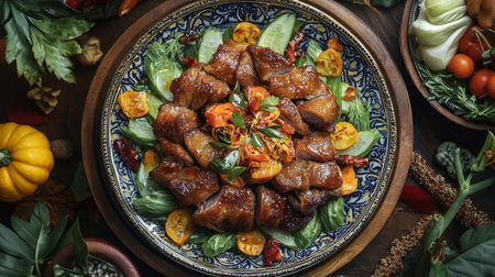 A vibrant arrangement of golden-brown fried pork belly pieces on a decorative plate, surrounded by fresh vegetables and garnishes, highlighting the dishs delicious appeal