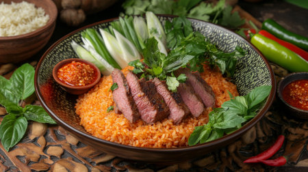 A vibrant display of beef rice served in a traditional bowl, accompanied by fresh herbs and chili paste, highlighting the flavors and textures of this beloved dish.