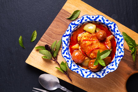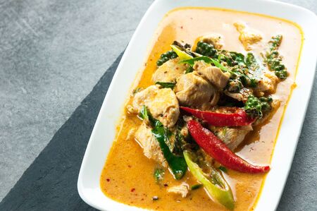 Thai Food concept Roasted chicken red curry on wooden board on black background with copy space