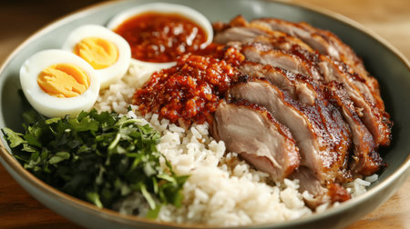 A mouthwatering plate of pork leg rice served with spicy chili sauce, soft-boiled eggs, and fresh greens.