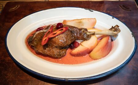 Duck leg with cherry sauce on the metal plate, baked in the oven with apples.