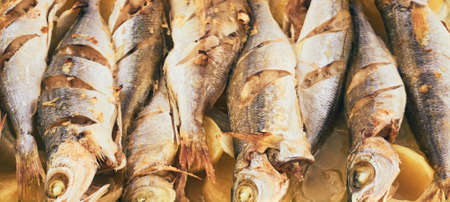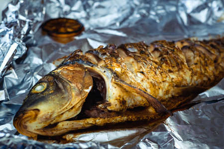 Grilled sea fish, close up. Fried fish on a baking sheet. Food concept