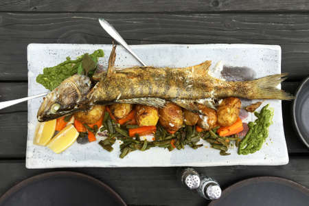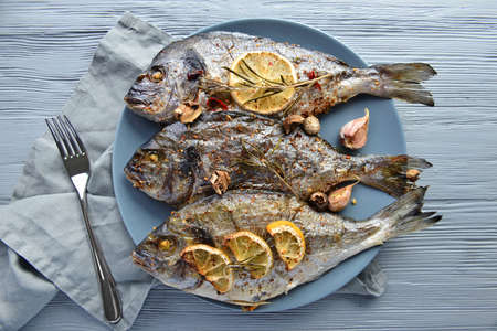 Fried dorado close up. Sea bream fish with lemon and rosemary on metallic tray. Roasted on grill coals dorado on plate decorated with vegetables. Top view. Close-up