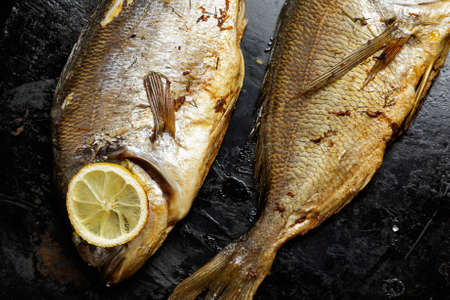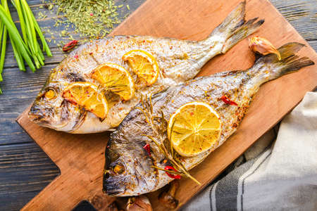 Roasted gilthead fishes with lemon, herbs, salt on black background. Healthy food concept. Food frame.