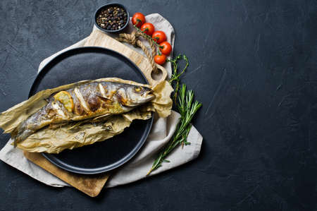 Grilled sea bass on Kraft paper in a black plate. Black background, top view, space for text