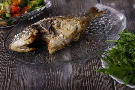 Grilled crucian on the board. Cooking fried fish. A dish of fried crucian carp. Tasty river fish. Fried fish.