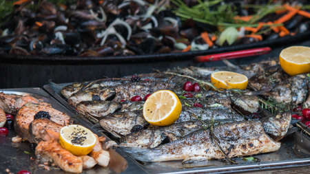 fried crucian carps decorated by lemon fruits, steaks of salmon and other seafood on food festival outdoors