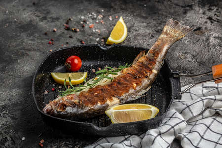 Grilled trout fish on the grill pan with lemon. banner, menu, recipe place for text, top view,