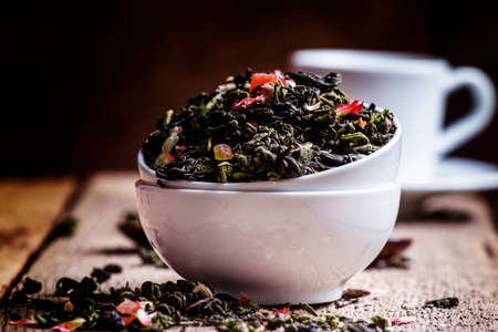 Dry organic green tea leafs in a black cup on a wooden background