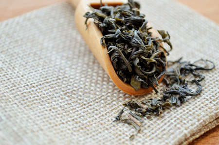A wooden spoon with leaf tea lies on a jute bag