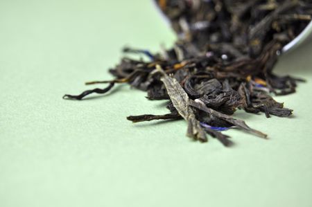 Loose black tea scattered on green background.