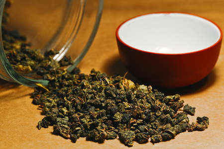 A cup of oolong tea and tea leaf on a wooden table.