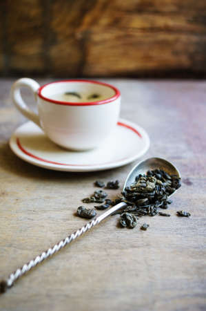 Green tea and leaves on rustic wooden table
