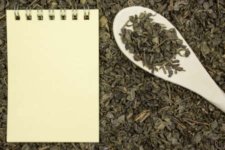 Dry green tea, a blank sheet of paper and a wooden spoon. Place for text