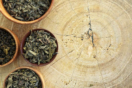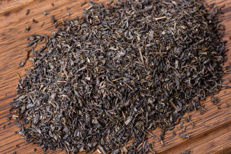 Dry tea leaves on a wooden background. Close up. Top view.