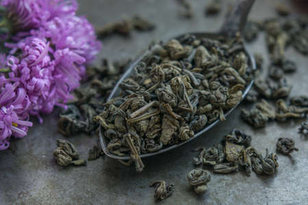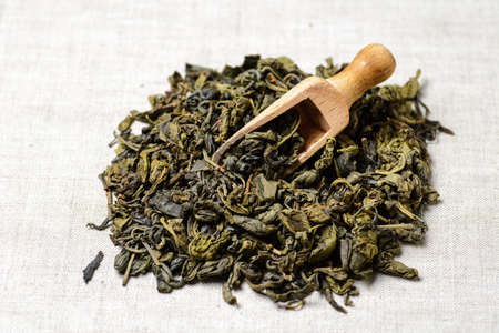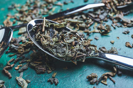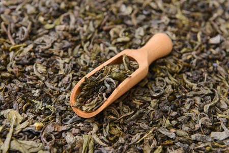 Scoop on dry green tea leaves, closeup