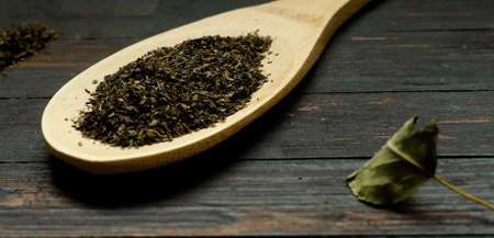 Spoon with dry green tea on dark table
