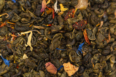 Dry tea with fruit and flower petals as background. Dried tea background. tea texture