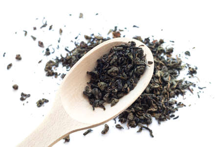 aromatic green dry tea on a wooden spoon, isolated on white background