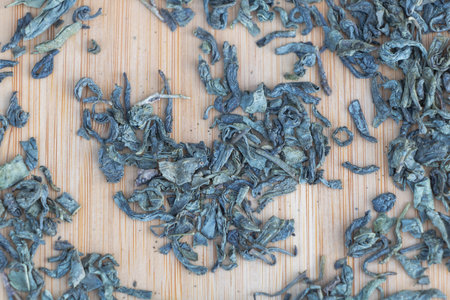 close up view of dried green tea leaves on the top of a light green table