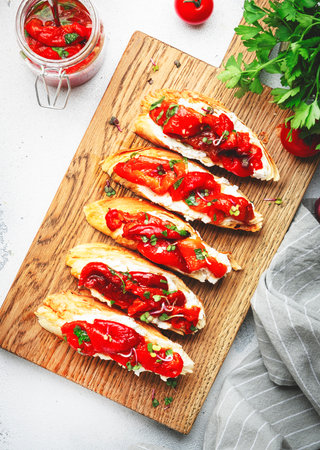 Crispy bruschetta with soft goat cheese and sweet red paprika in olive oil with herbs served on cutting board on white kitchen table background, top view